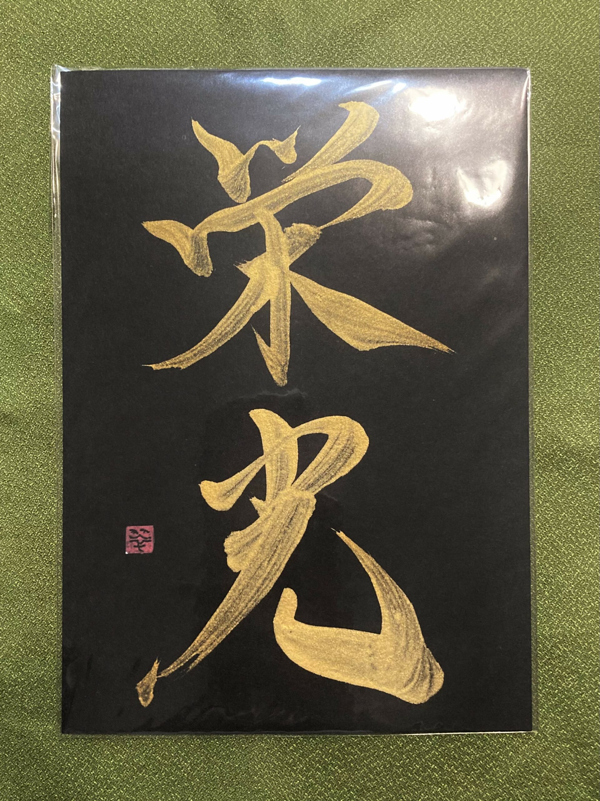 栄光 eikô, Gloire – calligraphie dorée sur fond noir, format A5