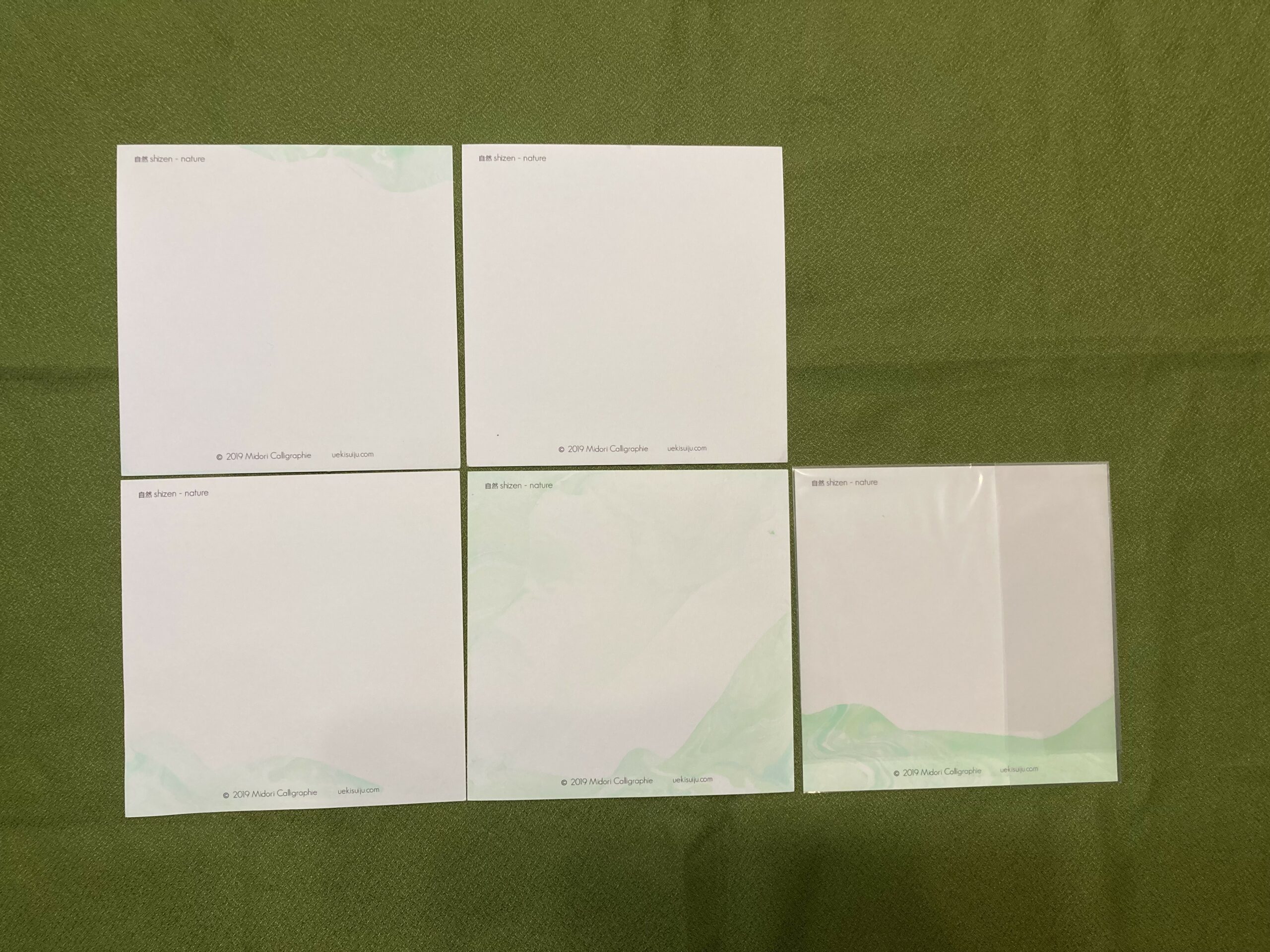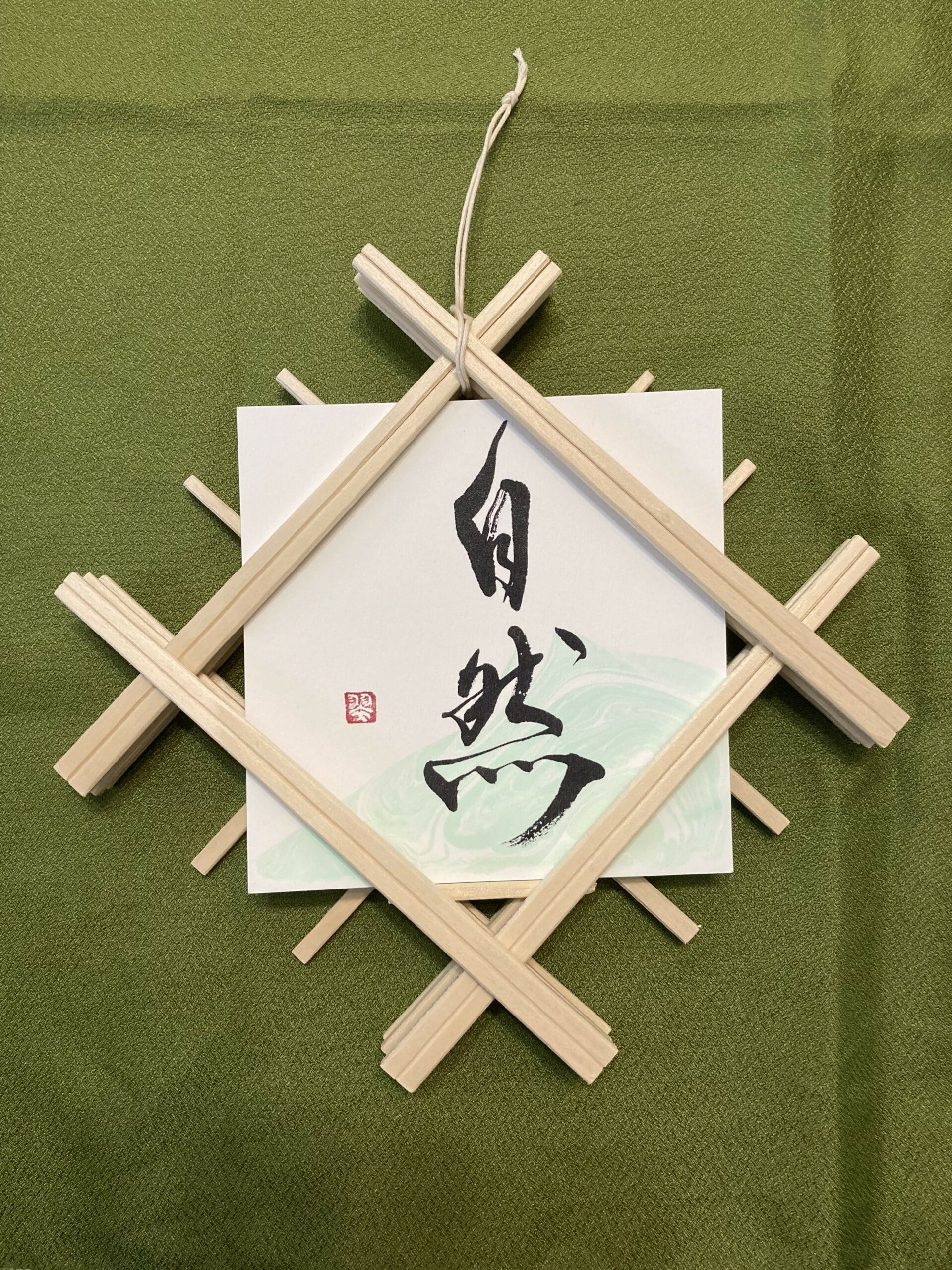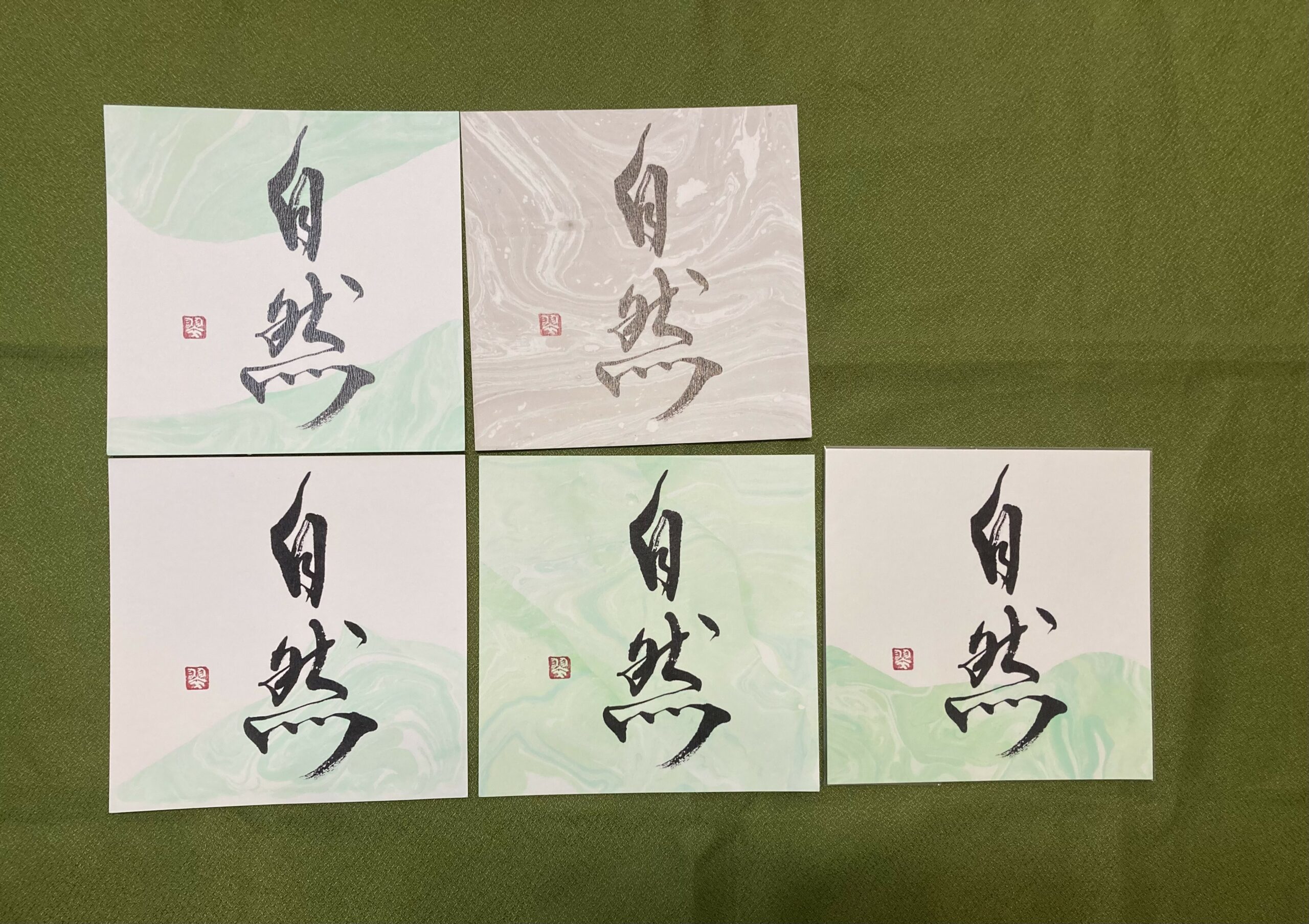 自然 shizen, nature – carte postale 14×14 avec calligraphie imprimée et suminagashi original