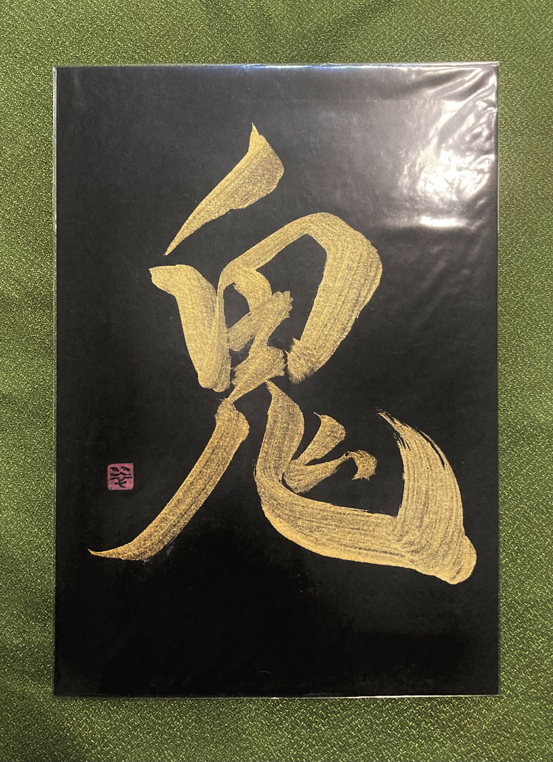 鬼 oni, démon – calligraphie dorée sur fond noir, format A5