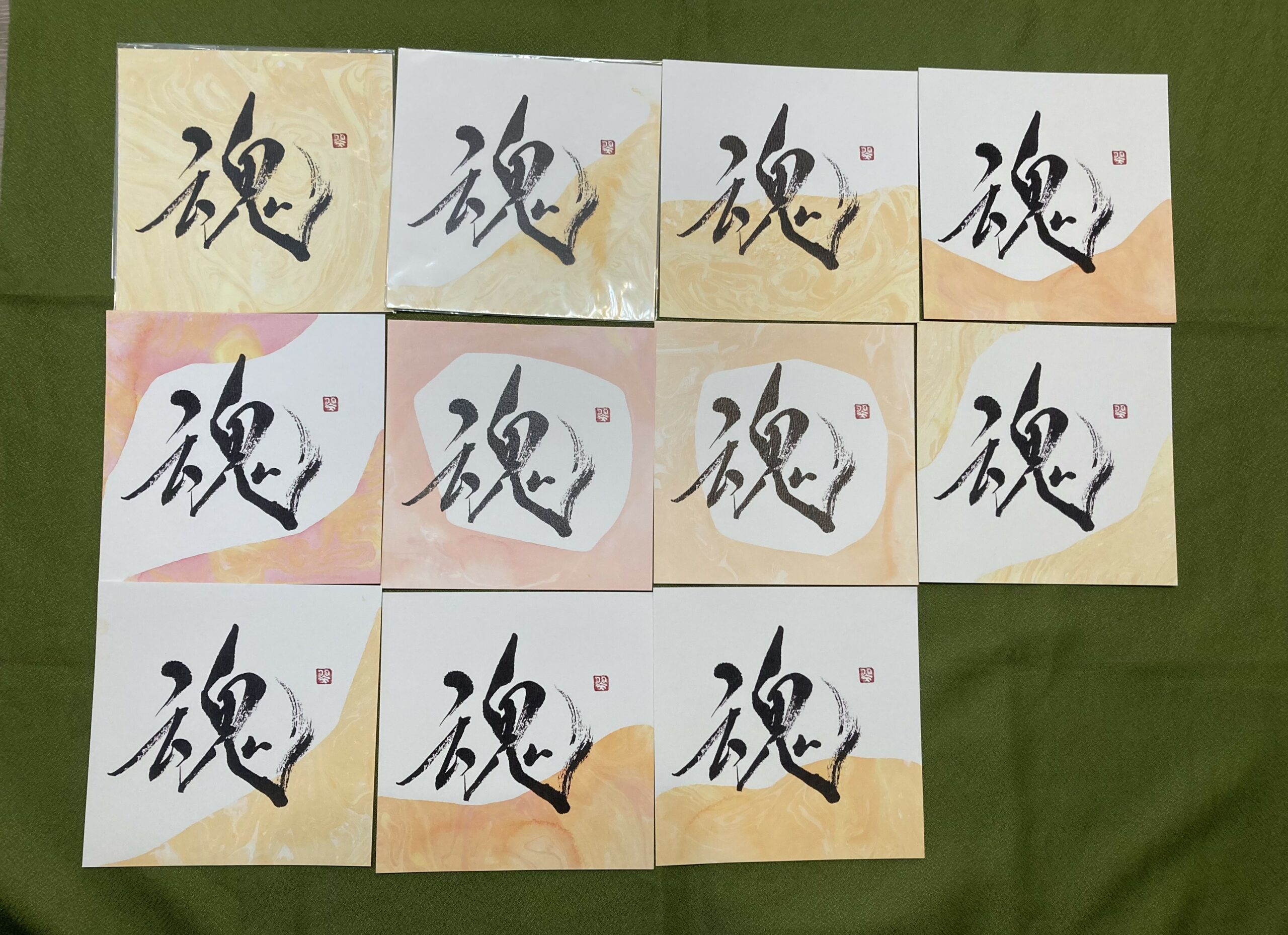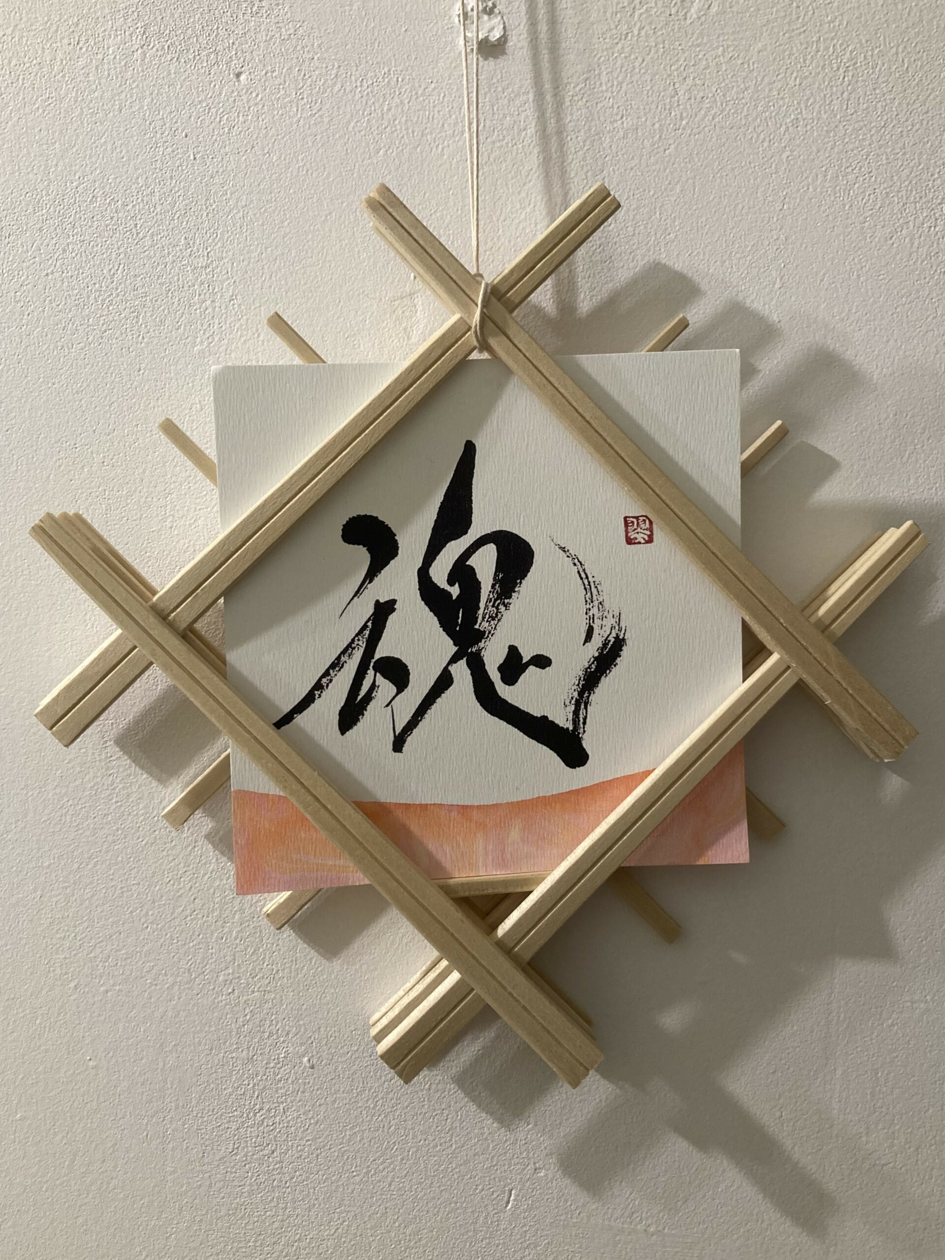 魂 tamashii, Âme – carte postale 14×14 avec calligraphie imprimée et suminagashi original [avec cadre]